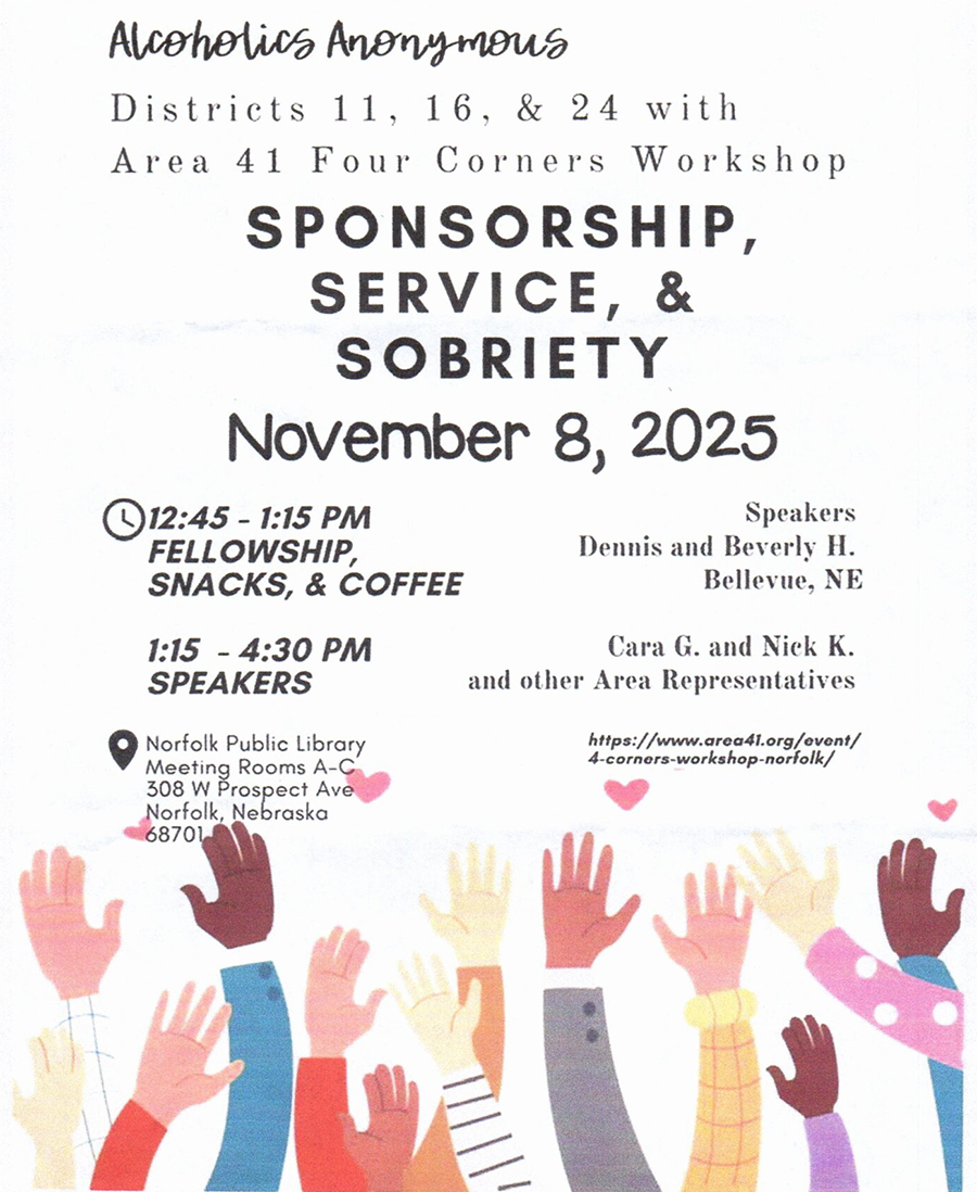Four Corners Workshop Saturday, November 8, 2025 12:45 PM 4:30 PM Norfolk Public Library 308 West Prospect Avenue Norfolk, NE, 68701 United States (map) Google Calendar ICS Sponsorship, Service, & SobrietyAn Area 41, Four Corners Workshop hosted by AA Districts 11, 16 and 24Speakers:Dennis and Beverly H., Bellevue, NE along with Cara G., Nick K. and other Area 41 Representatives click image to enlarge